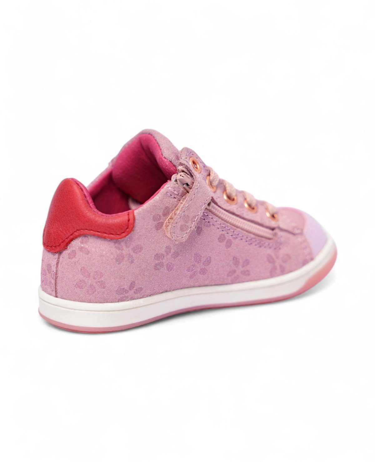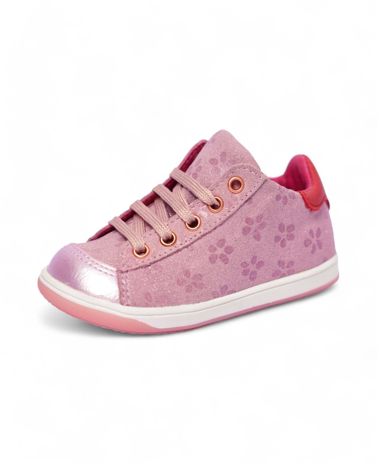 Baskets basses en cuir rose ornées de motifs floraux délicats pour une allure douce et féminine. Idéales pour accompagner les premiers pas de votre bébé fille, elles allient confort et style tout en offrant une praticité optimale.