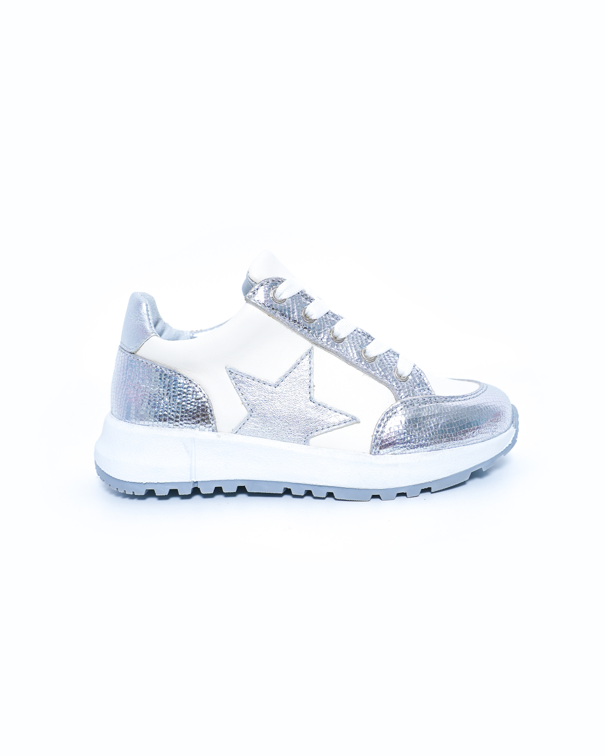 Baskets en cuir effet croco argenté avec étoile argentée, fermeture à lacets et zip latéral pour un look tendance et un enfilage facile.