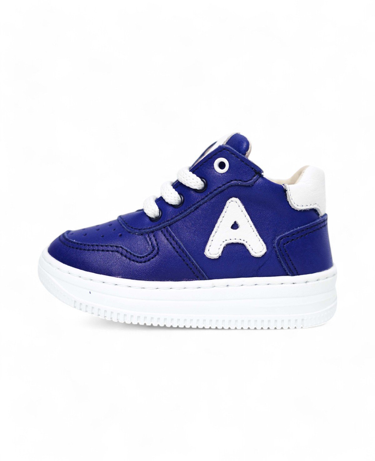 Baskets montantes en cuir bleu avec des détails blancs contrastants et une applique en forme de « A ». Confortables et pratiques, elles combinent lacets et fermeture éclair pour un ajustement parfait, idéales pour un look dynamique et moderne.