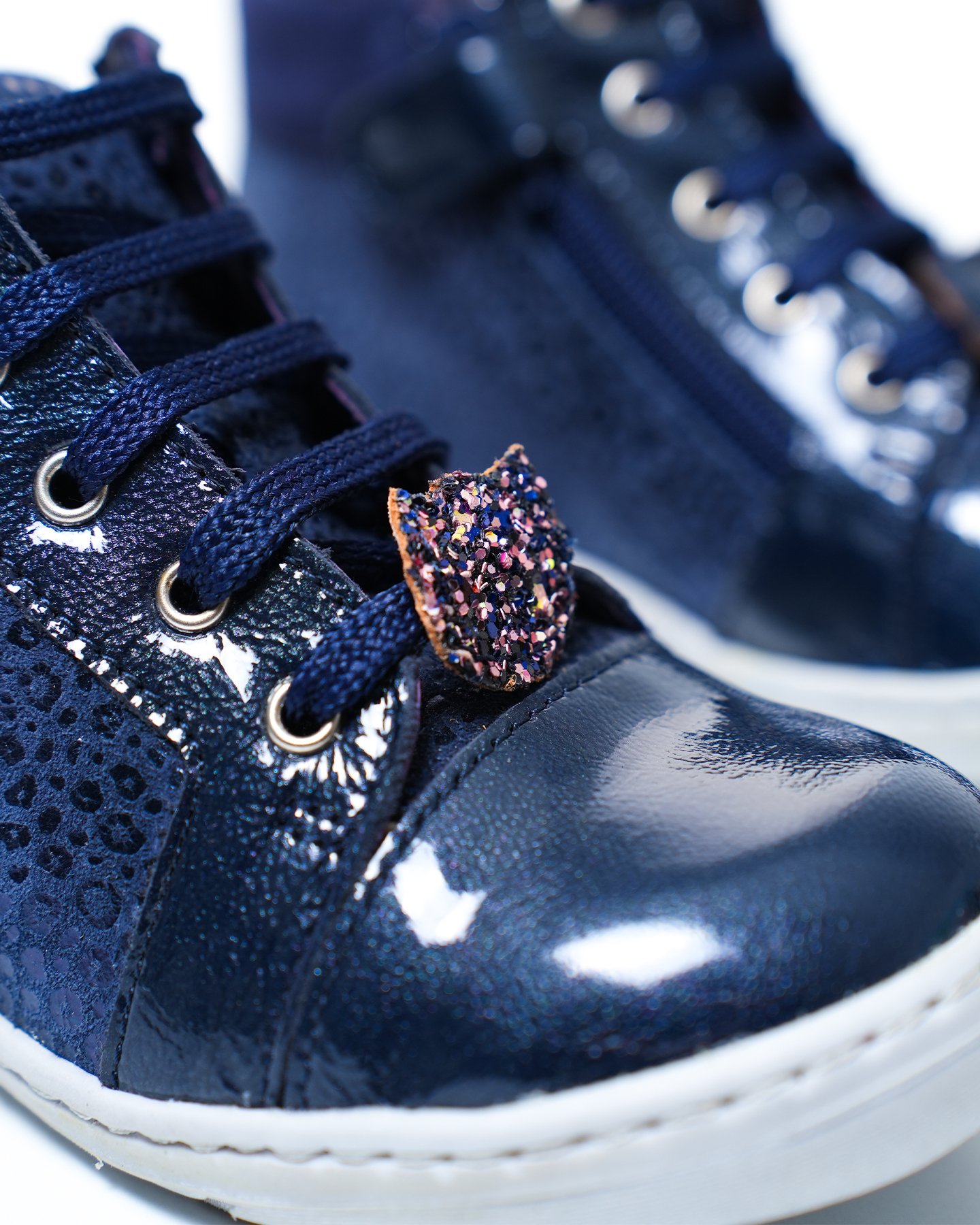 Bottillons fille en cuir bleu brillant avec détails texturés et charmant motif chat orné de strass. Conçus avec des lacets et une fermeture éclair, ils apportent une touche ludique et élégante aux tenues du quotidien ou des occasions spéciales.