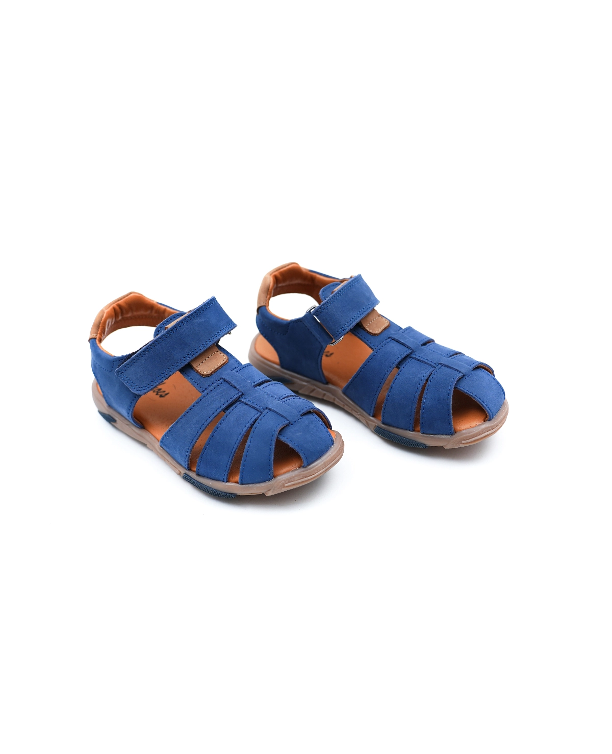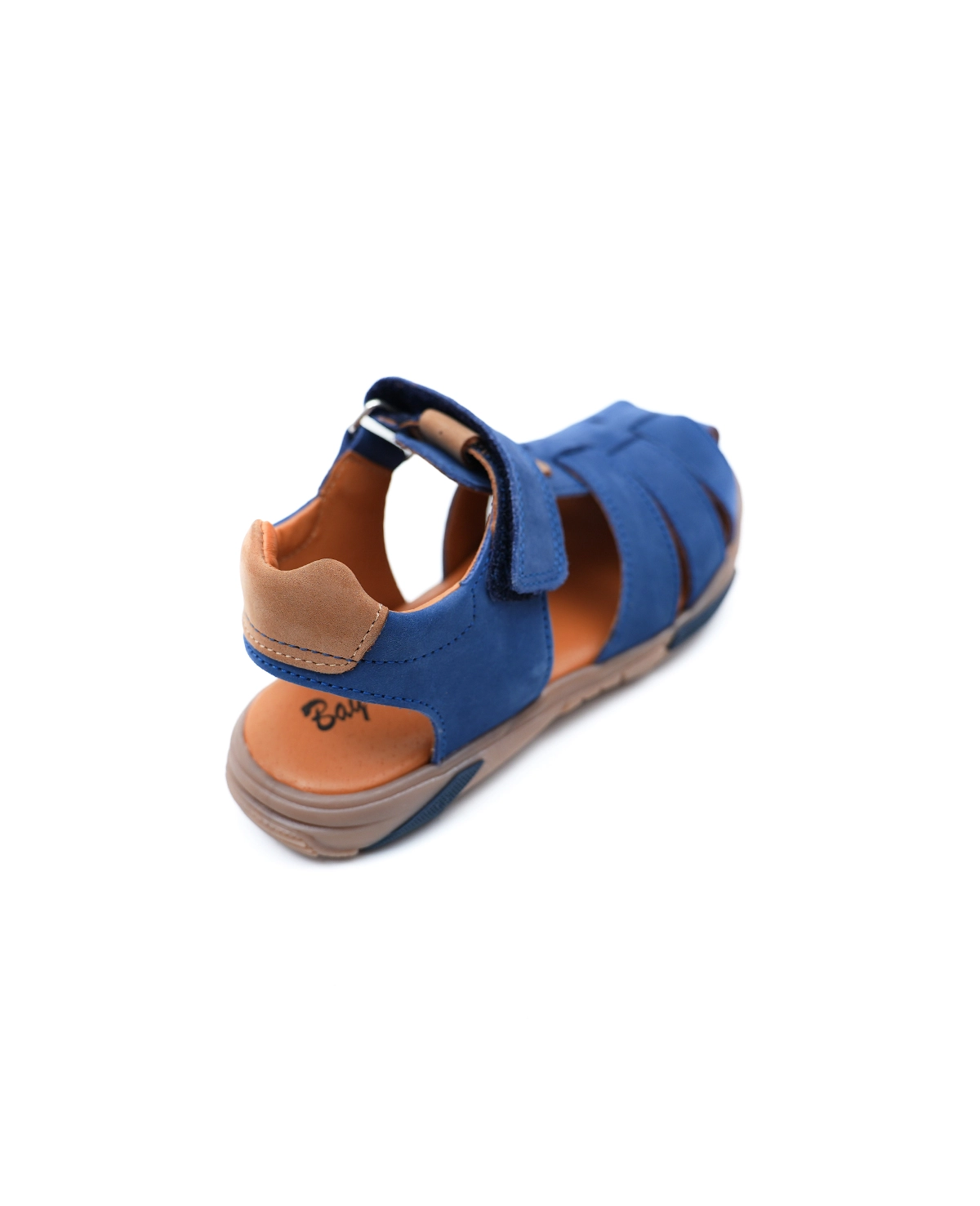 Sandales garçon en cuir bleu avec doublure camel. Bride à scratch pratique, semelle souple et antidérapante. Confortables et idéales pour les journées d’été actives.