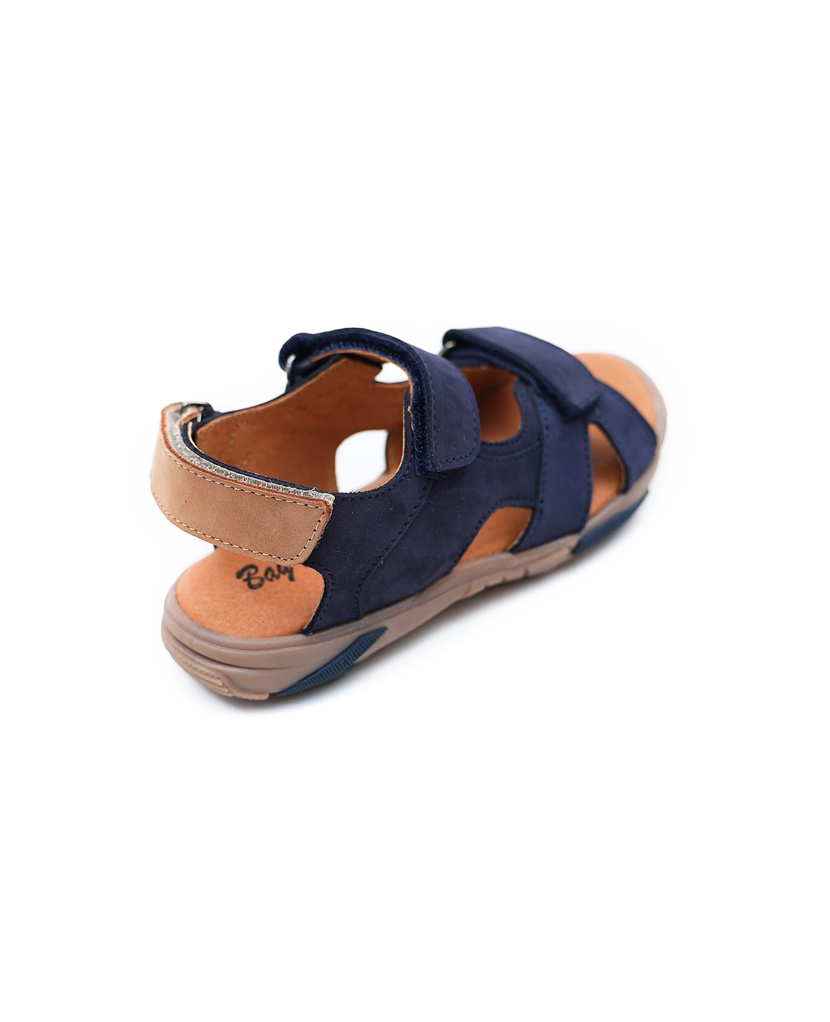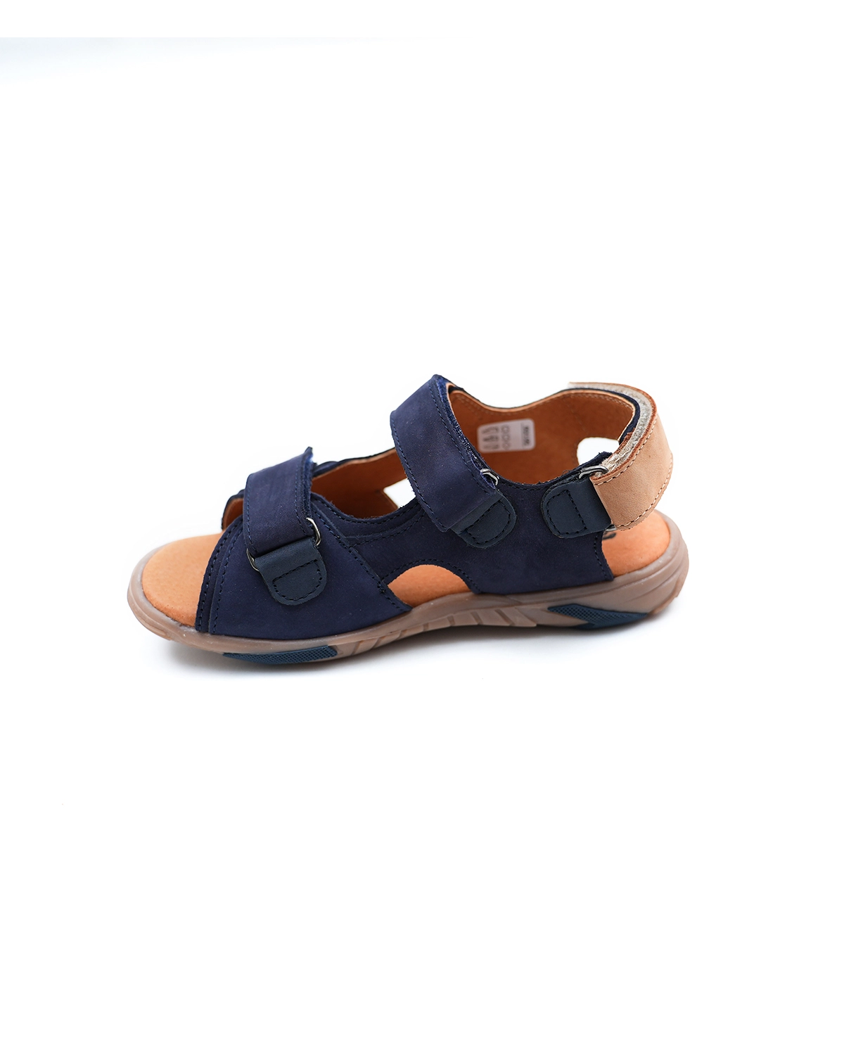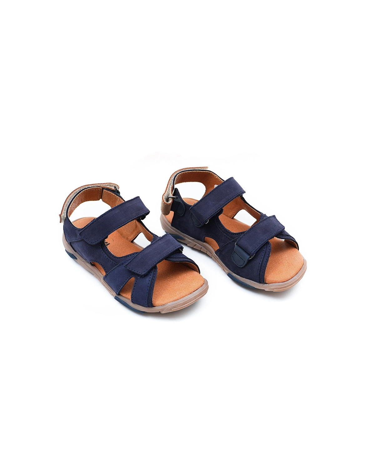 Sandales sport garçon en 100% cuir bleu foncé avec touche de beige. Trois brides à scratch pour un maintien optimal, semelle légère crantée et antidérapante. Idéales pour les journées actives en été.